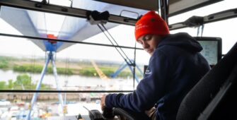 Almost touching the cloudy sky, high above Dry Dock 4, Lisa Brown of Apprentice Cohort #4 sits in the control room of Philly Shipyard’s large, blue gantry crane – known to employees as “Goliath” – on Day 7 of her crane operator training.